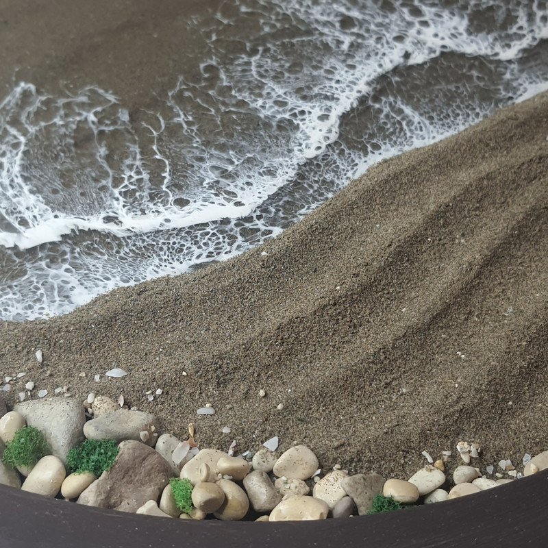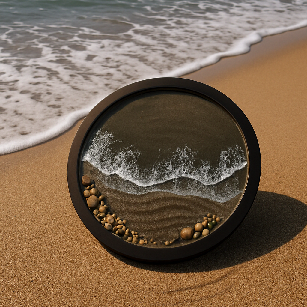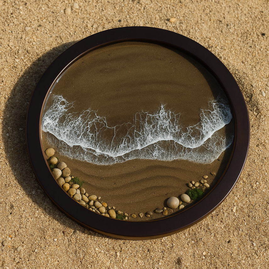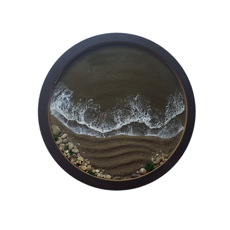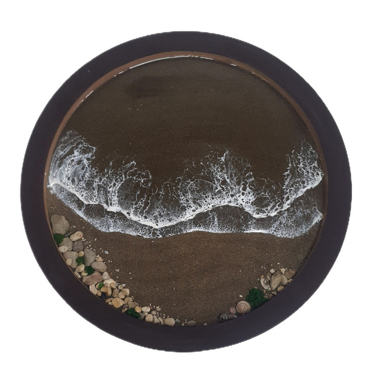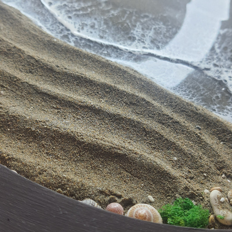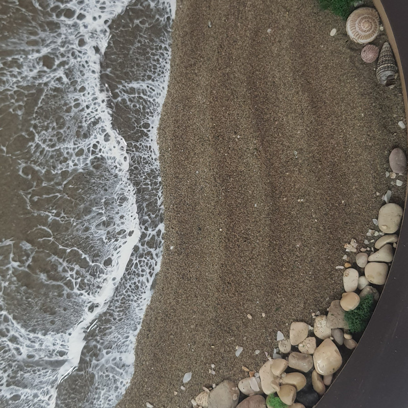 این تابلوی هنری با فرم دایرهای، بهصورت کاملاً دستساز و با استفاده از رزین شفاف، چوب MDF، شن طبیعی، صدفها و سنگریزههای طبیعی اجرا شده است. ترکیب موجهای سفید و پرجزئیات رزینی با بافت ماسهای و عناصر طبیعی، نمایی زنده از ساحل دریا را به تصویر میکشد؛ گویی لحظهای از طبیعت را در قاب نگه داشتهاید.