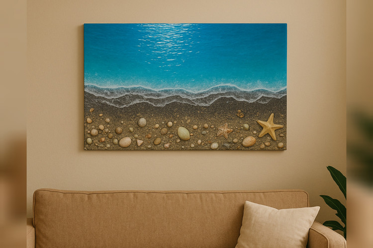 این تابلو هنری زیبا دستساز بوده و تک نسخه میباشد و ساخته شده از پنج لایه رزین شفاف در قسمت دریا که دارای شاینی زیبا و موج های برجسته که ترکیب این دو تداعی کننده تلالو آب و نور خورشید میباشد. همچنین تمامی قسمت های ساحل کاملا طبیعی است که شامل شن اکلیلی طبیعی، شن درشت و خرده صدف، گوش ماهی های سوزنی و گرد، صدف، ستاره طبیعی، سنگ های طبیعی و دو عدد ماکت قایق و لاک پشت میباشد. این طرح خاص آرامش و زیبایی بی نظیری دارد و به علت طبیعی بودن ساحل انرژی خوبی به همراه دارد. بیس کار ام دی اف، که پشت کار کاملا تمیز و دارای روکش چوبی قهوه ای میباشد.