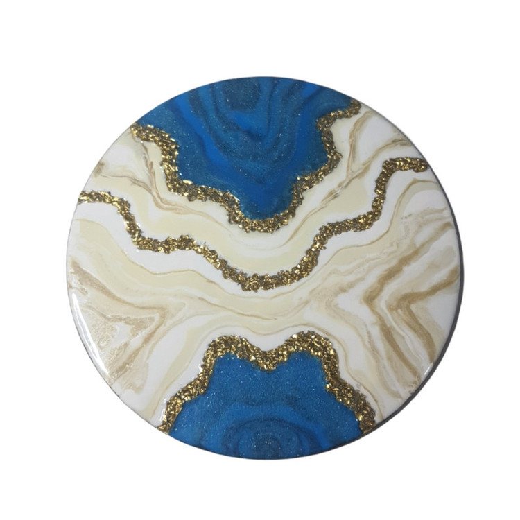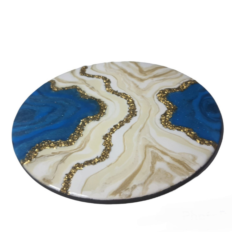 این تابلوی دایرهایشکل با تکنیک ژئود، با استفاده از رزین شفاف، رنگهای شاین و کریستال های طلایی طراحی شده است. موجهای هماهنگ و بافتهای لایهای، الهامگرفته از برش سنگهای معدنی و بلورهای طبیعی هستند که ظاهری بسیار لوکس، درخشان و منحصربهفرد به اثر بخشیدهاند.